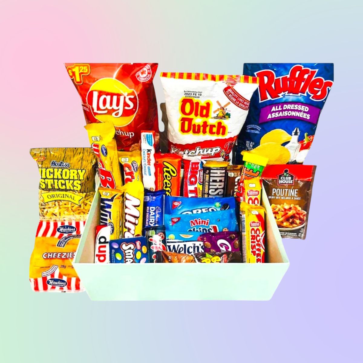 Best Canadian Snack Box consists of lays ketchup, all dressed ruffles, old dutch ketchup, cadbury chocolates. Gift Box for any occasion
