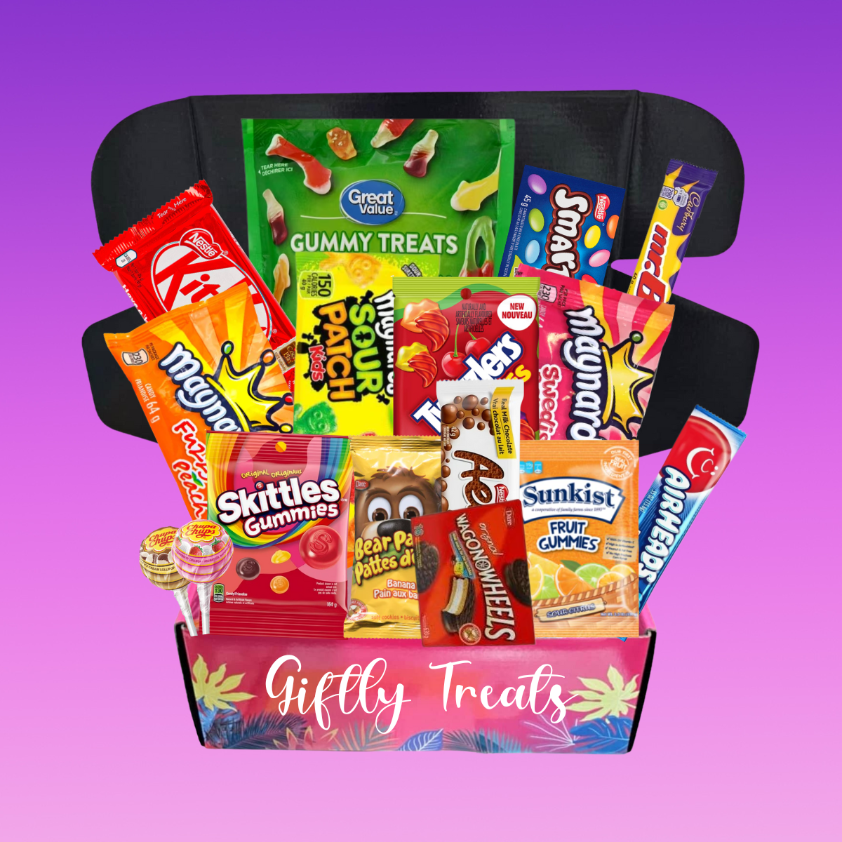 Inside, you’ll find a mouthwatering variety of beloved Canadian snacks, including Aero chocolate, KitKat, Smarties, and Mr. Big chocolate bars, alongside other fun treats like Bearspaw chocolate chip cookies, Wagon Wheels cookies, and Sunkist fruit snacks. There’s also a selection of chewy candies, including Maynards Fuzzy Peaches, Swedish Berries, Sour Patch Kids, and Skittles Gummies. To top it off, you’ll find Chupa Chups lollipops, Twizzlers gummies, Airheads candy, and Great Value Gummy Treats!