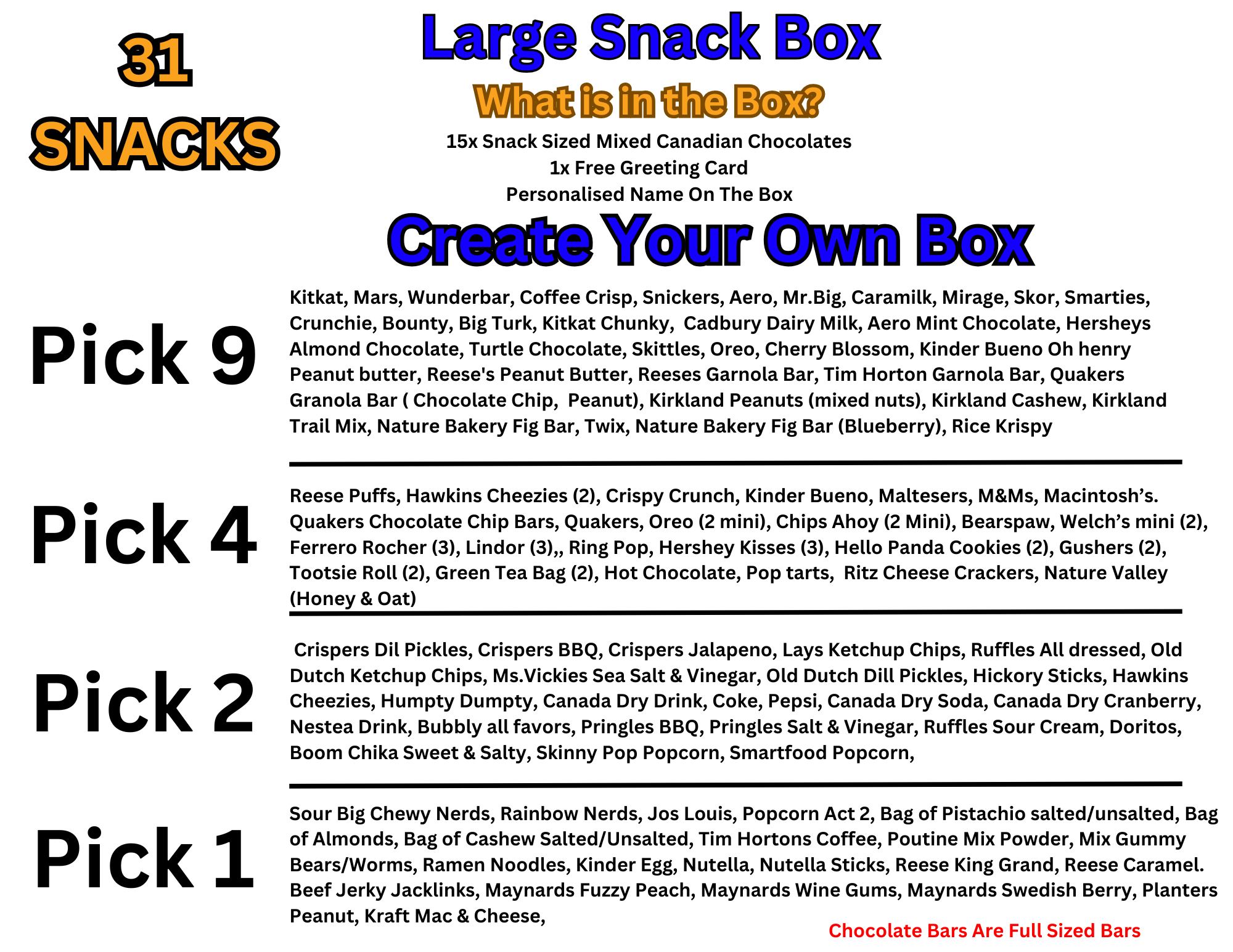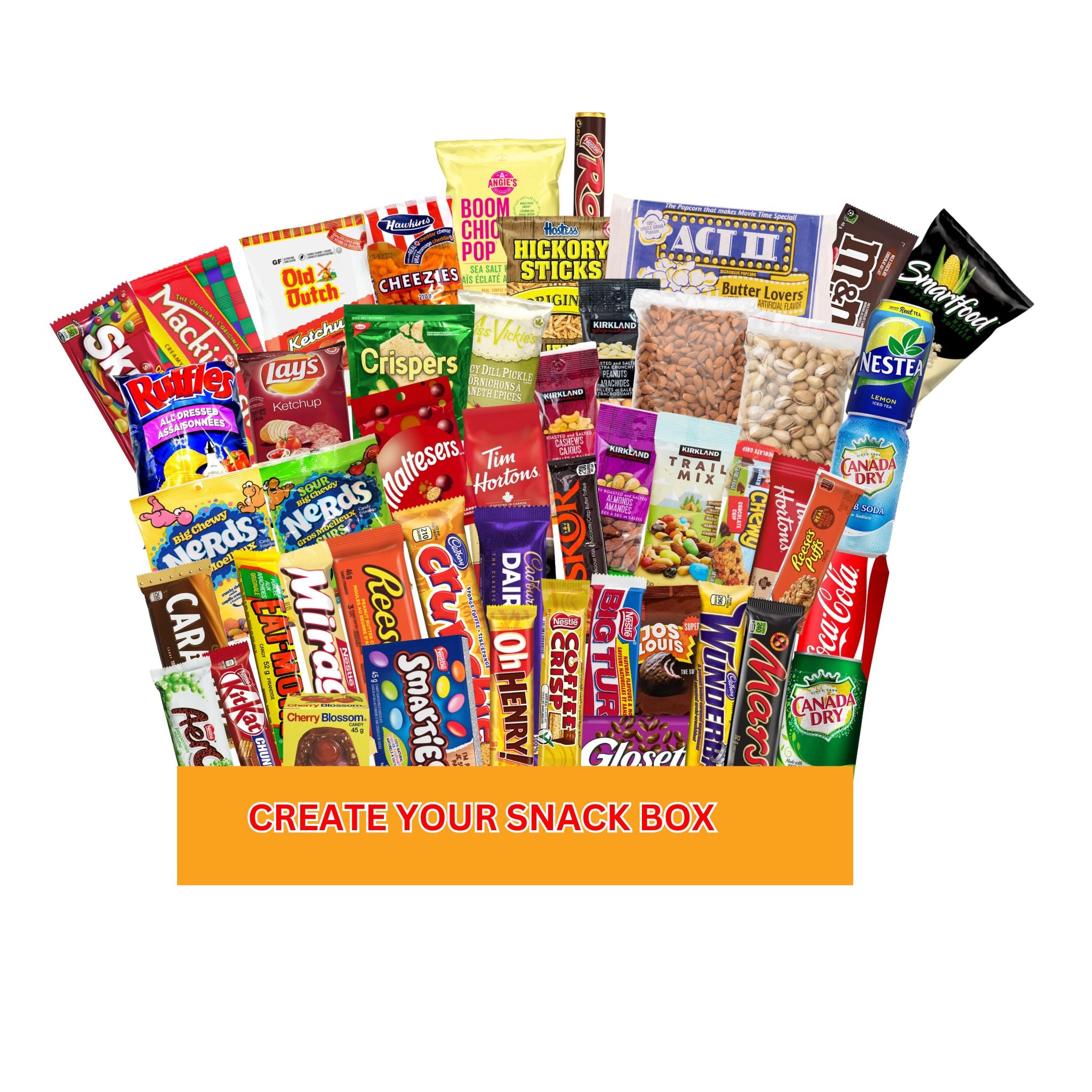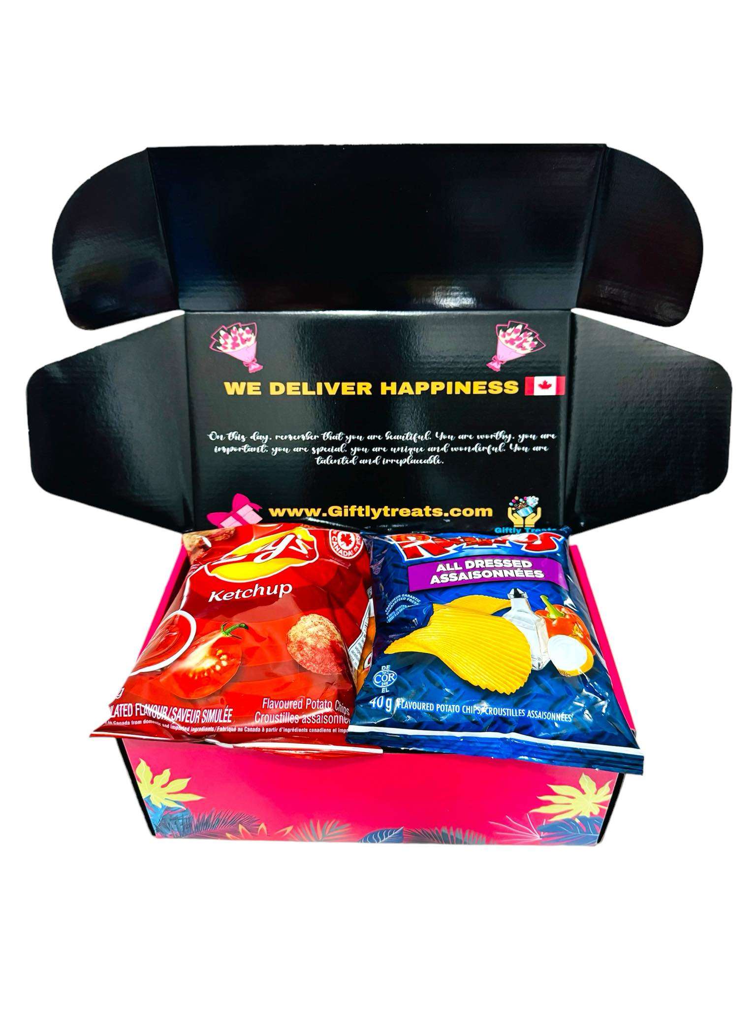 Create Your Own Canadian Snack Box! This Customizable Snack Box is a great Food Hamper for any occasion. Looking for the perfect Christmas Gift, Care Package, Birthday Gift, Valentines Gift, College care package, thinking of you gift, long distance relationship gift, gift for him, gift for her or looking to taste Canadian snacks? Wanting to taste some of the most popular Canadian Snacks such as Lays Ketchup, Ruffles All dressed? Then Look no further & order now! Want to send someone a Taste of Canada? Create the perfect Gift box on your own!